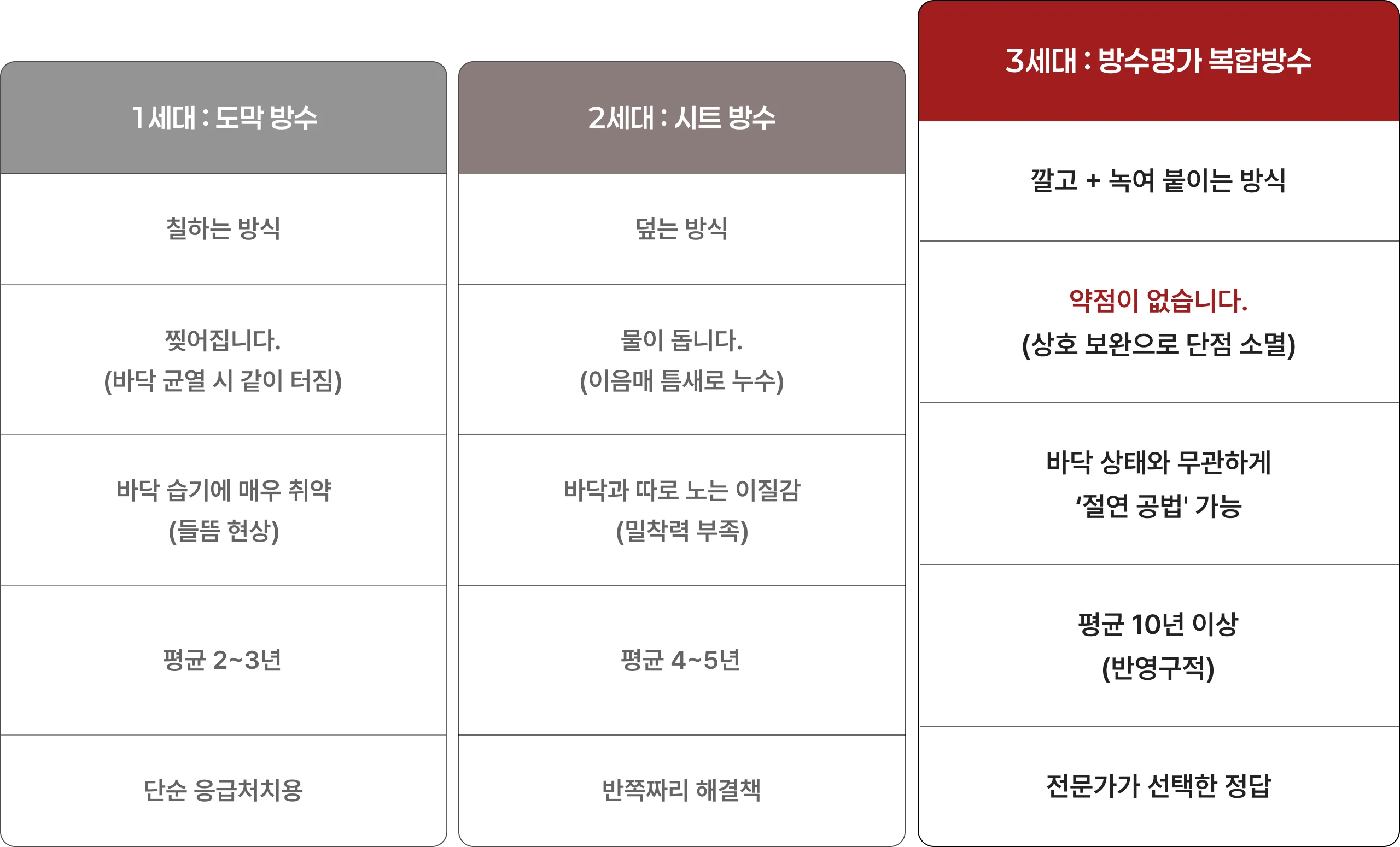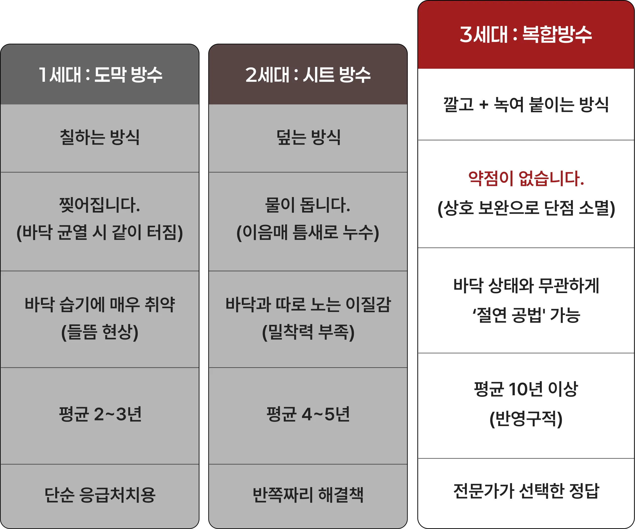 이것이 방수명가가 수 많은 시행착오 끝에, 서로 다른 성질을 결합한 이중 복합 방수를 최종 채택한 이유입니다.