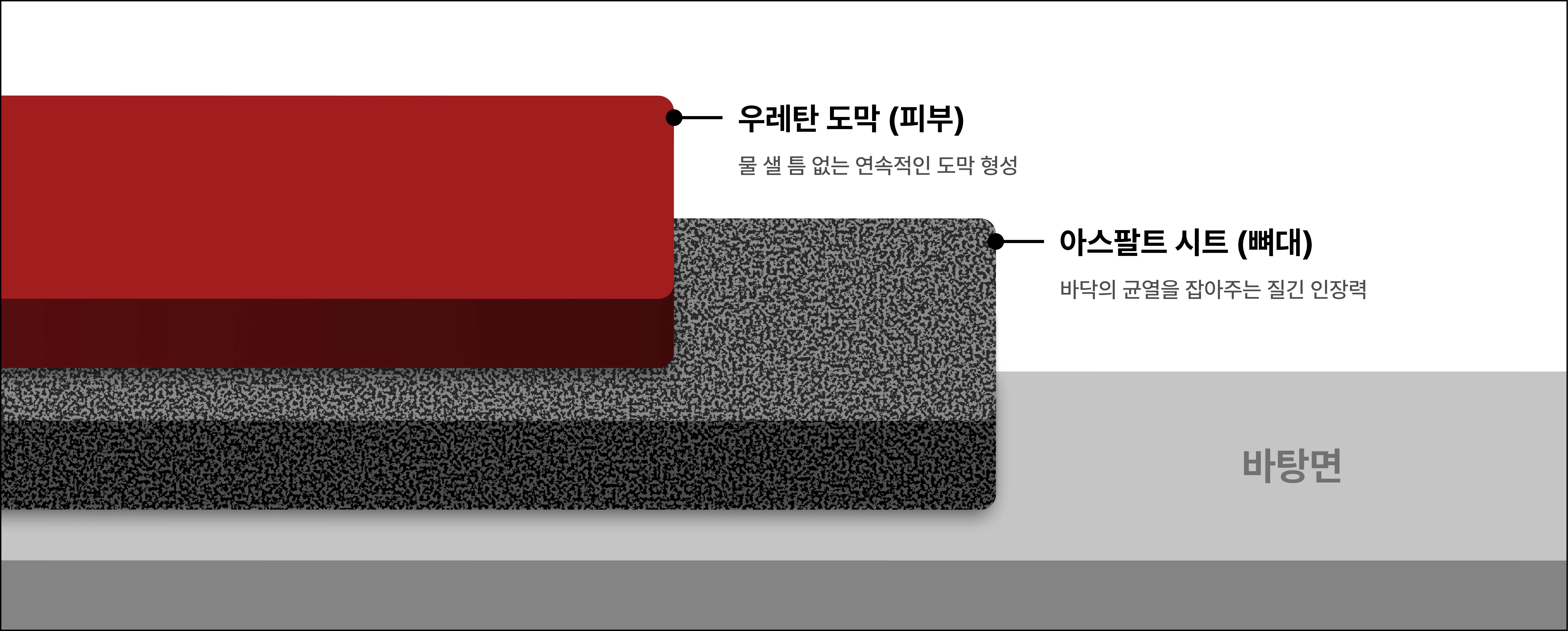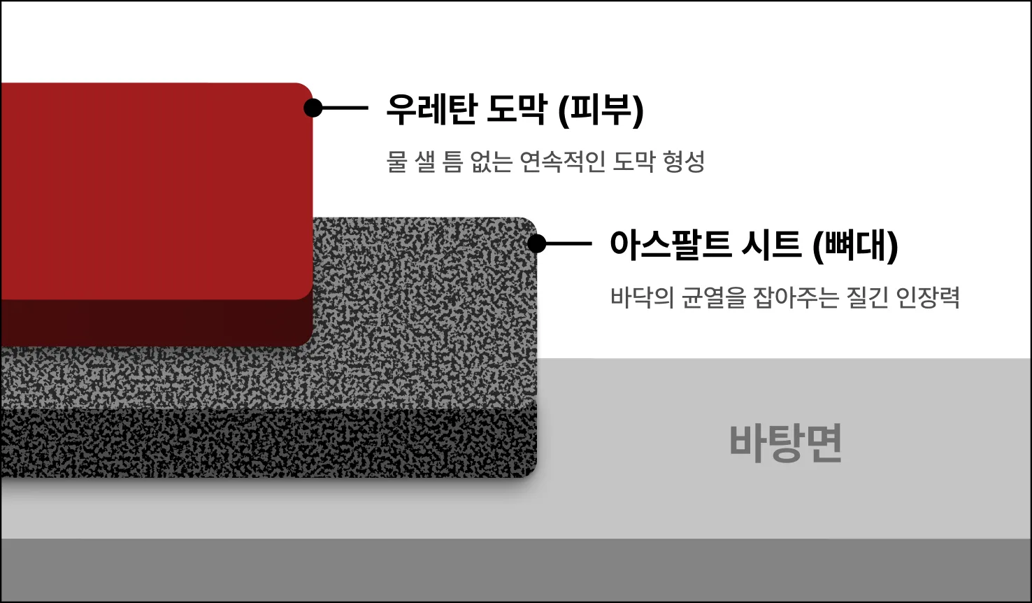 건물도 철근과 콘크리트가 합쳐져야 튼튼하듯, 방수층도 두 가지 성질이 결합되어야 합니다.
