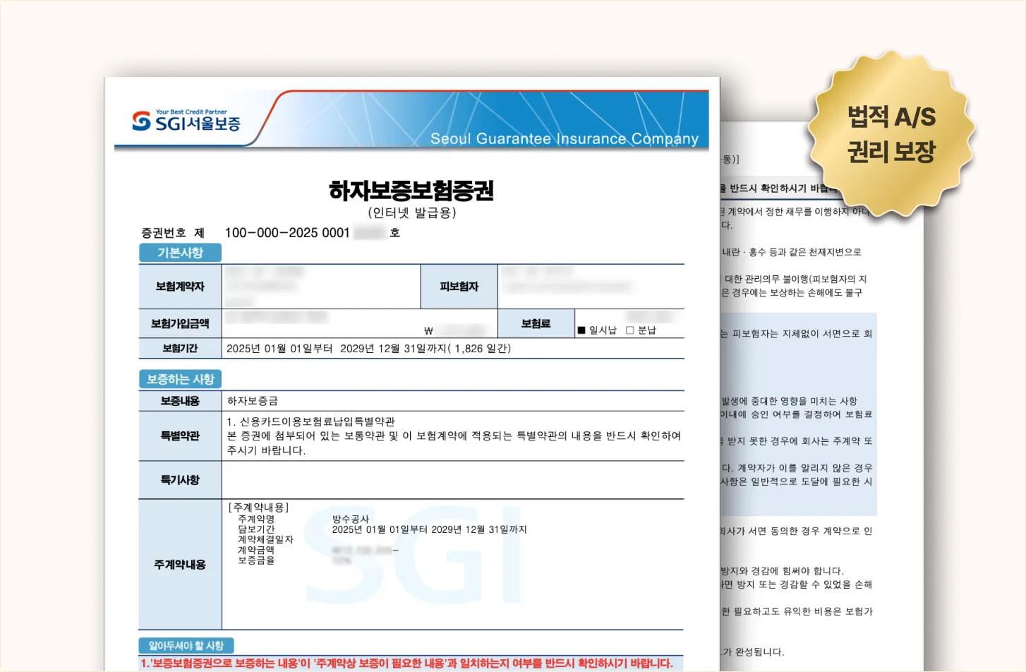 남들이 보지 않는 바닥의 기초부터 집착하기 때문입니다. 최대 5년 무상 보증을 가능하게 만든, 방수명가만의 집요한 시공 기록을 공개합니다.